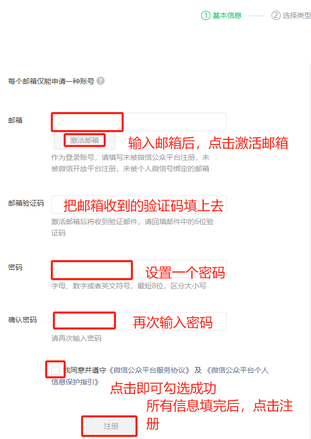 注意:一个邮箱只能注册一个类型的公众号,并且一个手机号、微信号、身份证也只能注册一个公众号。