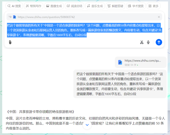 这里也可以单独处理,或是直接点击你想要提取的这个问题的链接,直接让豆包AI包你把这个链接里面所有高赞回答的内容重点给提取出来。同时,让AI帮你把提取的这些内容,给组成一篇新的文章。