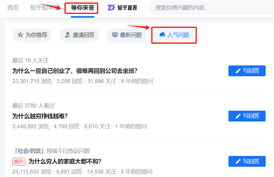 为什么不选择前面的3种,为你推荐、邀请回答、最新问题?因为这些三块,都是系统会根据你账号推荐,或是通过平台推荐。人气问题,则是在知乎上,人气最高的问题。