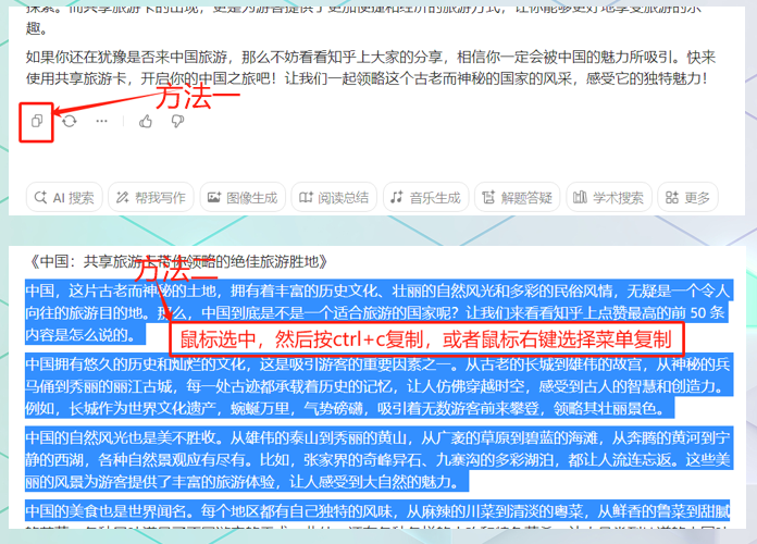 这里需要注意下,如果写出来的内容已经符合你的要求,需要复制使用的时候,这里有两种方式。一种,直接点击下面的复制按钮这里,一键复制;另一种,就是通过鼠标左键滑动光标选择,然后复制。