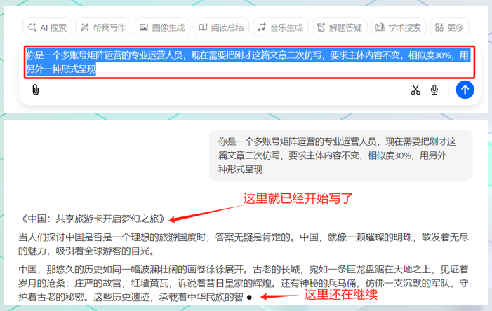 因为只有一篇,所以,同一个平台,你只能发布一次。如果想要发布同平台多个账号怎么办?直接把文章复制到AI工具,二次仿写。