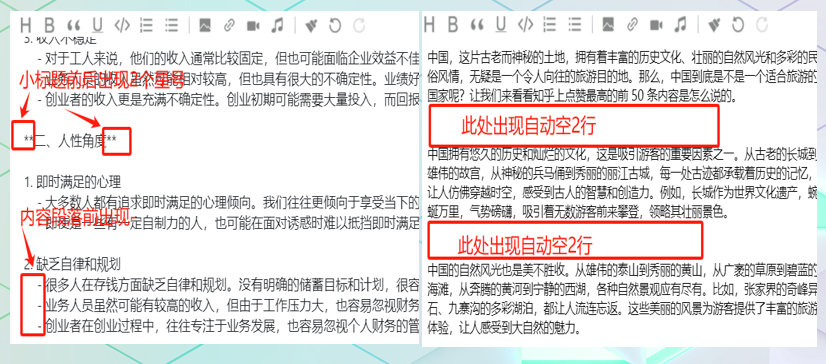 这两种复制有所区别,如果我们使用方法一复制出来直接使用,可能会在小标题前后处会出来两个星号,或是-,或是所有的内容不会自动分段。使用方法二复制的内容粘贴,每个段之间可能会自动空2格。