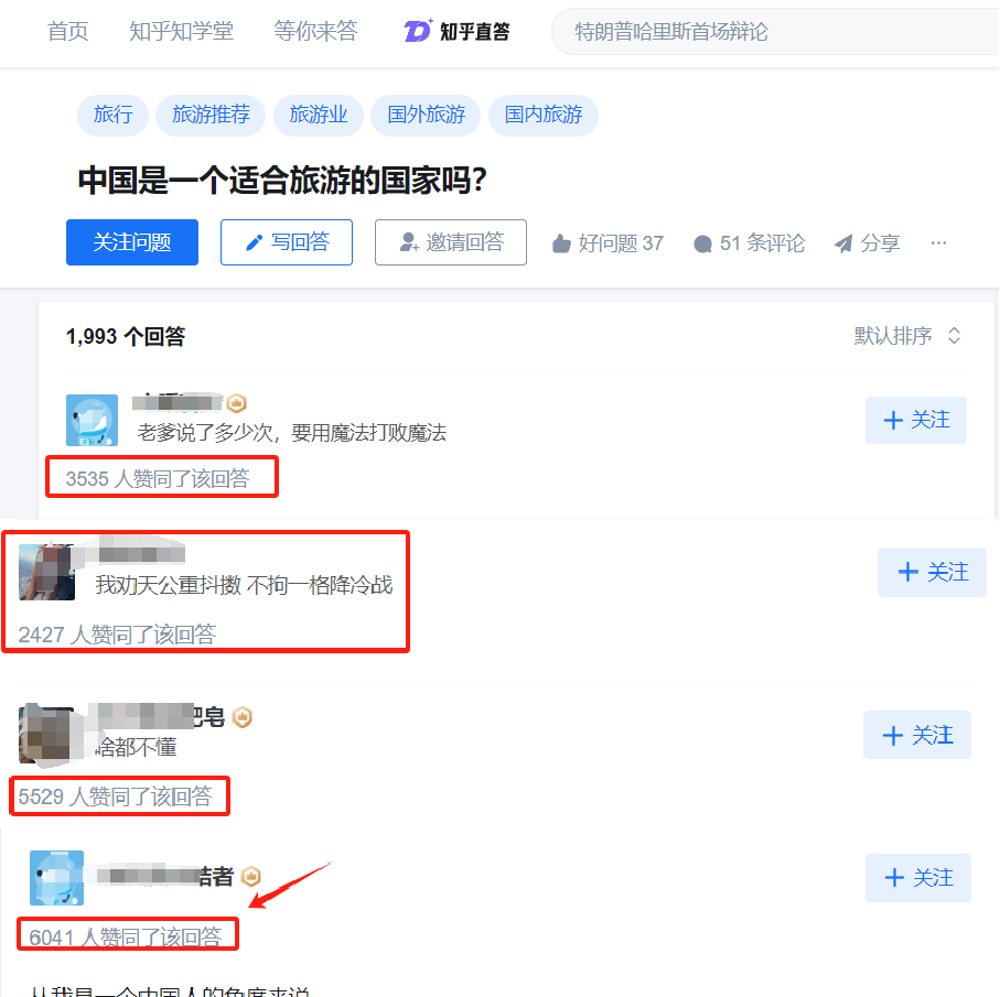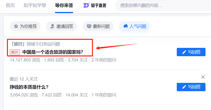好比咱们旅游卡版块,你看这个话题“中国是一个适合旅游的国家吗?”现在处于飙升阶段,对于咱们做旅游创业的伙伴,直接可以去这个话题下面回答,借流量。