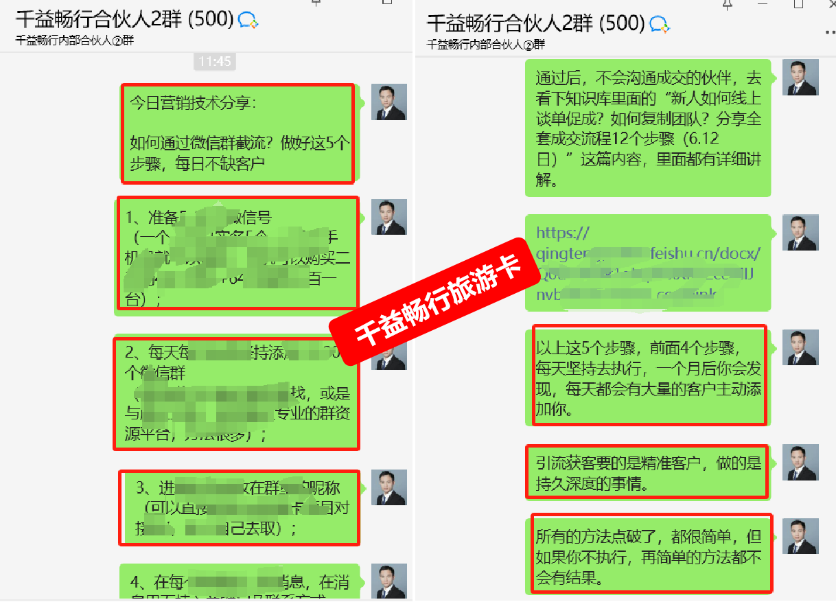 之前我在“旅游卡项目如何在线上做推广?3定、3学、3执行,零基础孵化!”这篇文章里面有分享过。针对零售,就是点对点的找爱旅游的客户;针对批发,就是直接寻找商家;针对招商,就是直接寻找创业者。