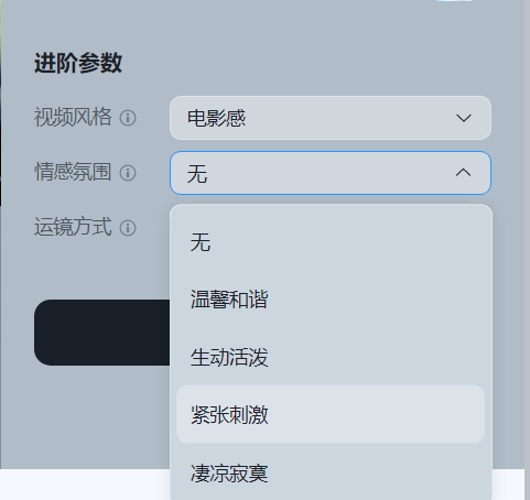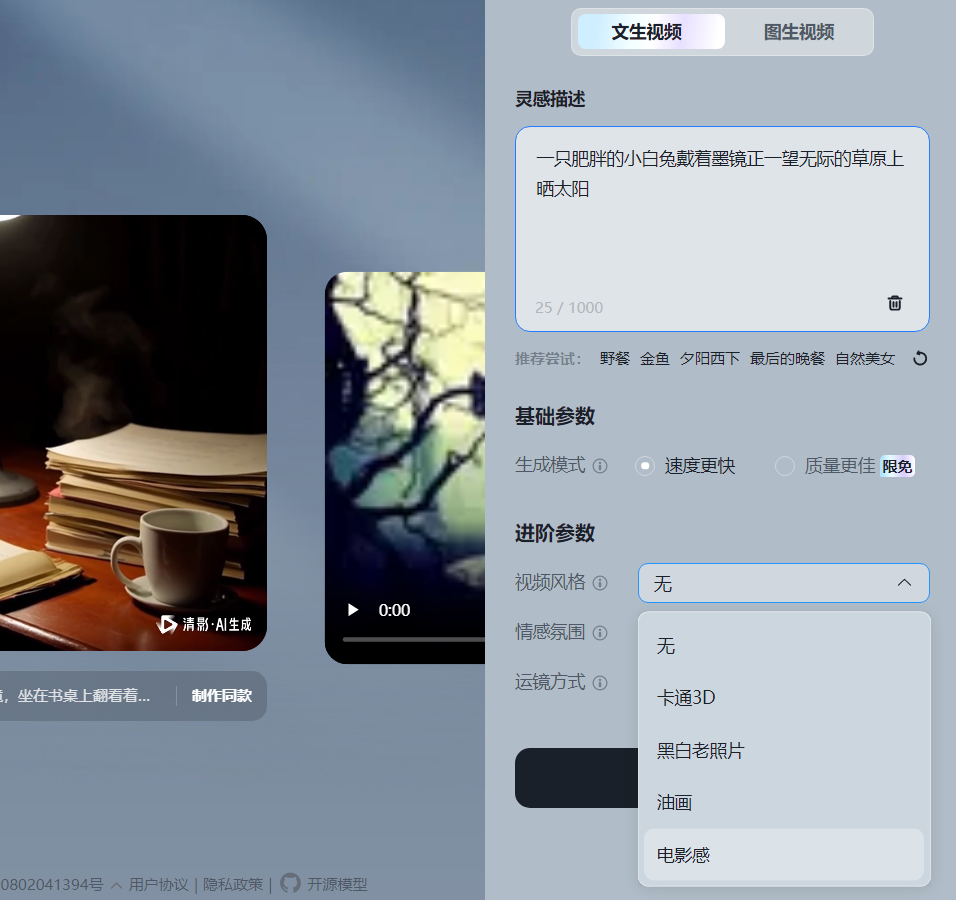 这里进阶参数,视频风格有:卡通3D;黑白老照片;油画;电影感。也可以选择无,这样系统就会自动判断。