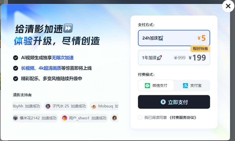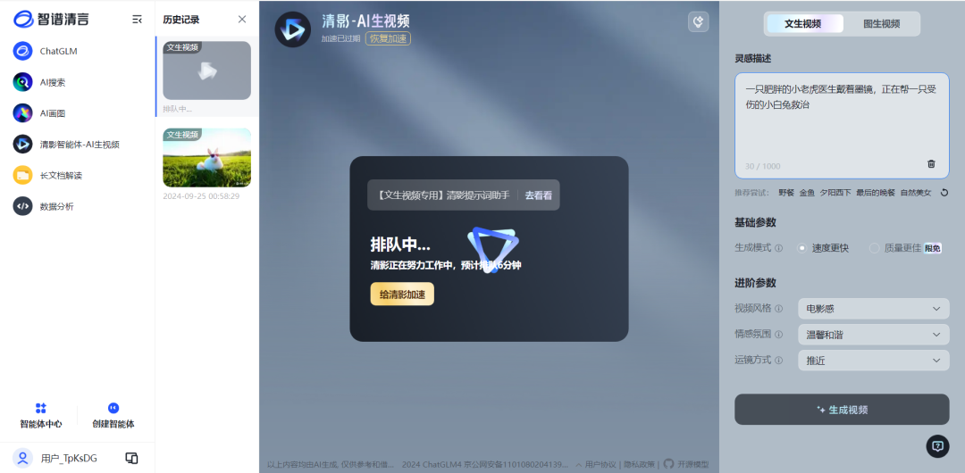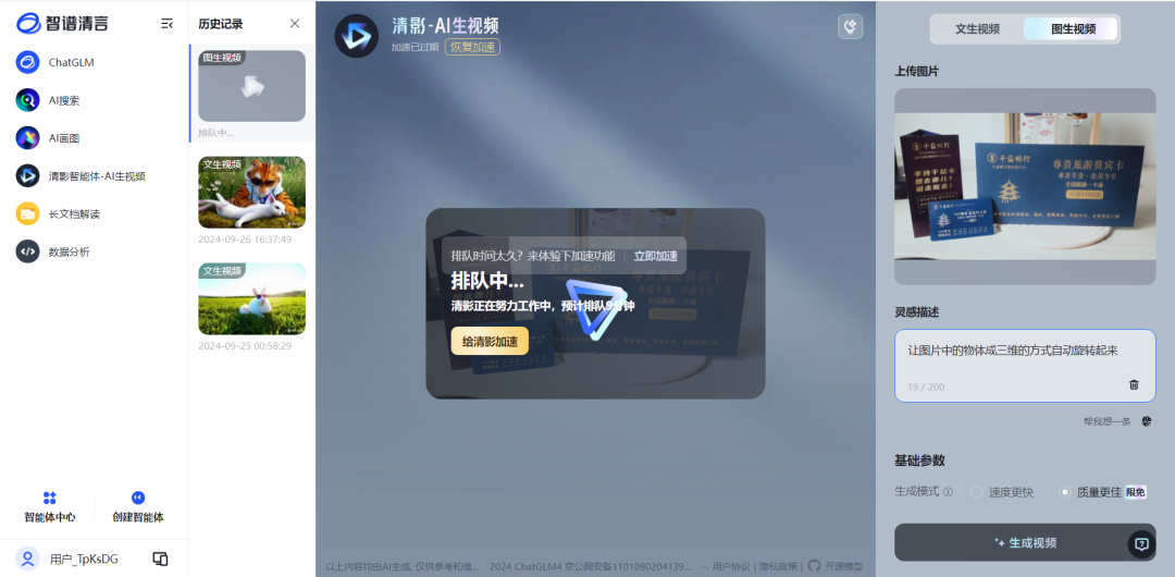 设置好后,点击生成视频,系统就会显示下面这样,排队中…清影正在努力工作中,预计排队X分钟。如果需要加速生成,那就开通会员即可。