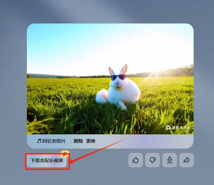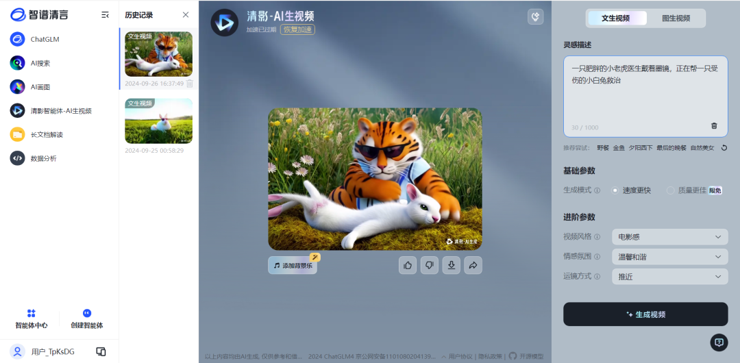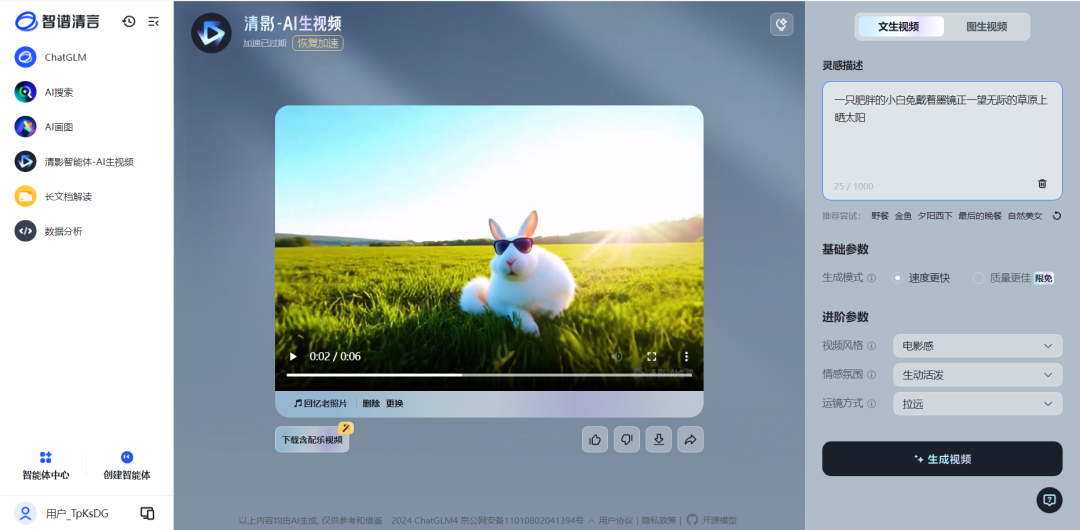 比如我用:“一只肥胖的小白兔戴着墨镜正一望无际的草原上晒太阳”这个指令,大概5-10分钟就帮我把视频搞定了。