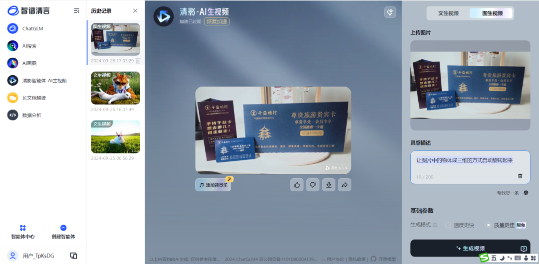 下面我又使用了图生视频来测试,上传一张咱们共享旅游卡的图片来生成视频。我的指令是:让图片中的物体成三维的方式自动旋转起来。其实我想要的是图片自动立体式旋转,但是生成出来的视频相对来讲,效果就稍差些。