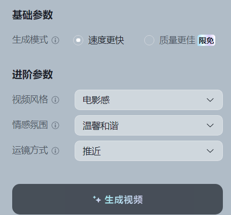在下面的参数这里,生成模式可以选择速度更快,或是质量更佳。如果是速度更快,就是5-10分钟;如果是选择质量更佳,生成的时间就会长一些。