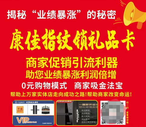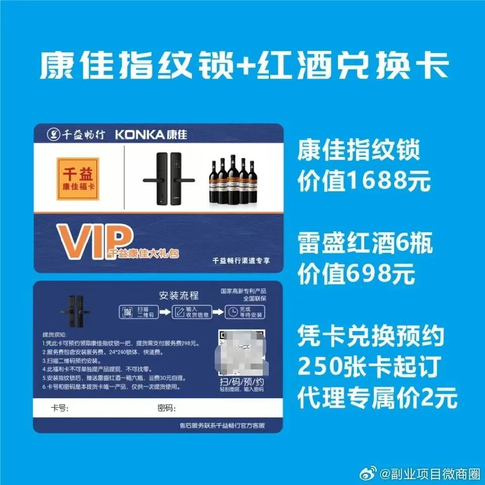 旅游卡价值4980,康佳指纹锁京东价1688,雷盛红酒698,三件套直接打包做营销。康佳指纹锁卡和雷盛红酒卡融合在一张卡,合伙人采购贰圆壹张,兑换时只需要扫卡面上的二维码识别进去填写资料兑换。兑换时候客户需要支付298元锁的安装费用和红酒邮寄费用。