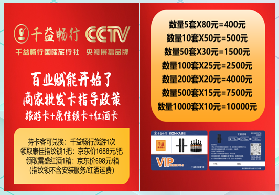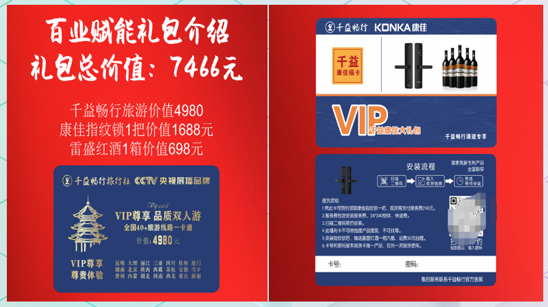 共享旅游卡本身作为低价格高价值的赋能产品,之前就有伙伴单独卖299-699之间,甚至更高。现在结合康佳指纹锁,雷盛红酒,把这两款产品也做成礼品卡兑换的形式,与咱们千益畅行旅游卡结合。