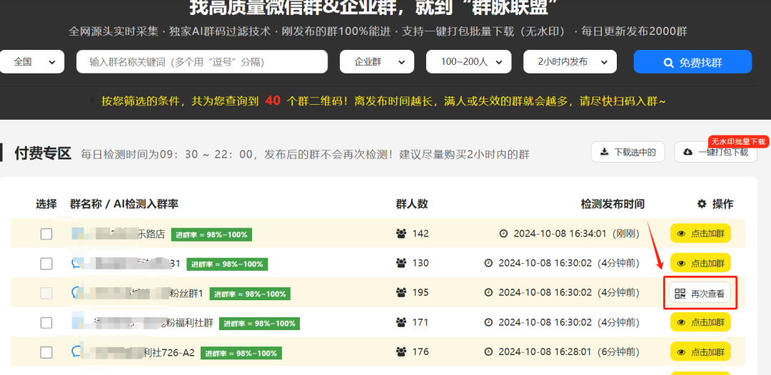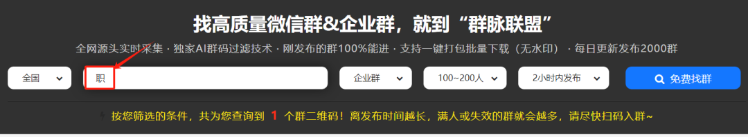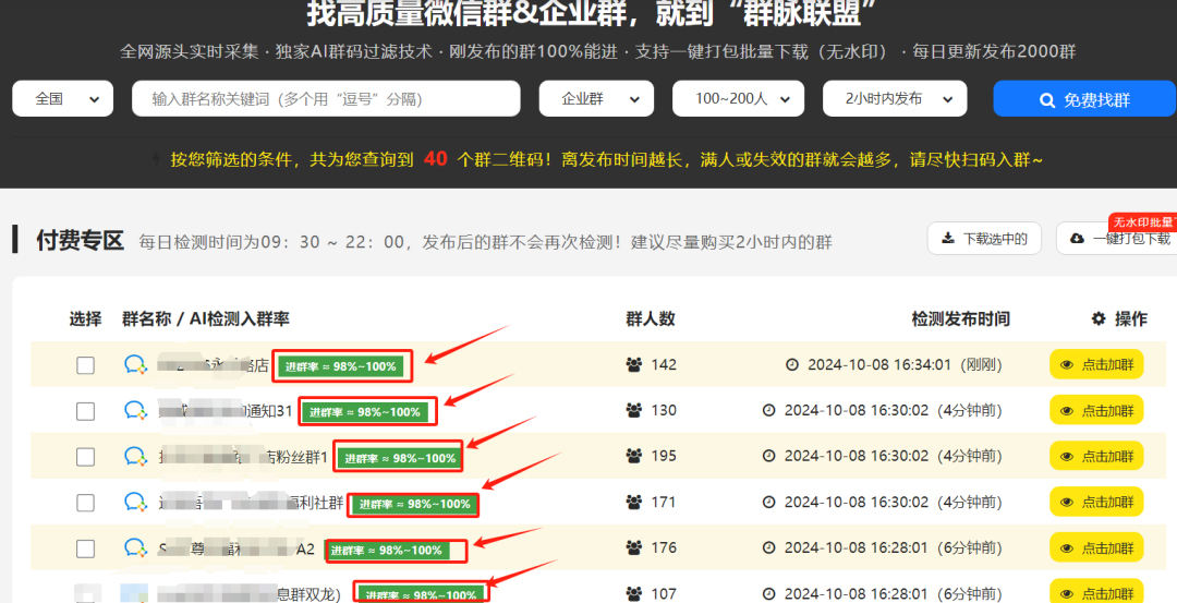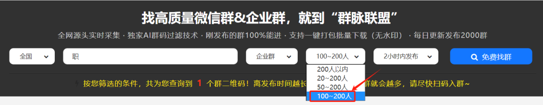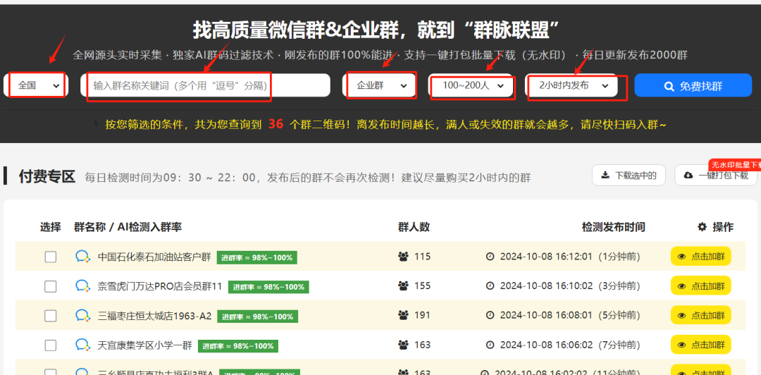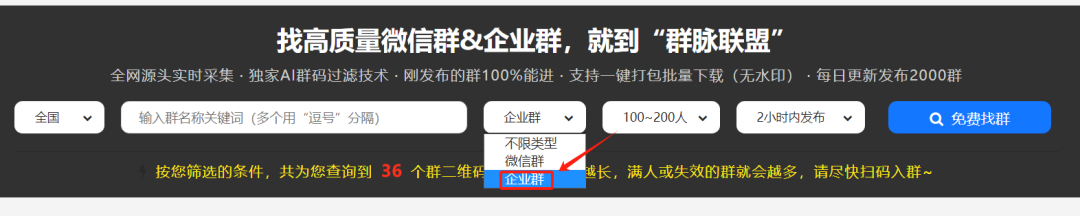 进去群脉联盟平台点击每日加群菜单,这样就到寻找群的界面。在这里,每天早上9:30至晚上22:00都会实时检测更新群资源,包含企业微信群和个人微信群。