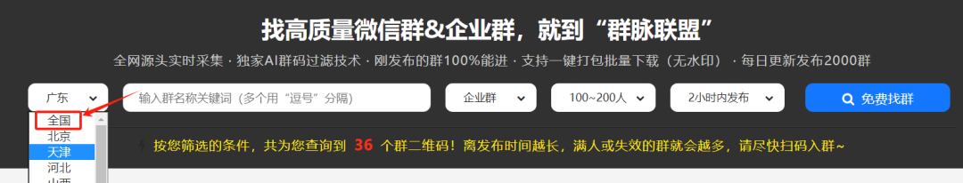 1)地区筛选这里可以不用选择,因为很多地区是没有多少群。比如你选择广东,可能同一时间出来的就几十个群。选择全国,这样同一时间出来的群会多些。群满200人就会自动下架,所以这个可以随时询盘。