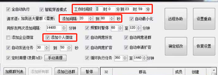 添加时间间隔,这里设置为20-80秒,一般我设置为25-55秒,这是比较合理的范围。频繁时暂停60分钟至120分钟,这是风控管制。同好友两次添加间隔可以设置长一些,避免循环添加太频繁导致别人反感。