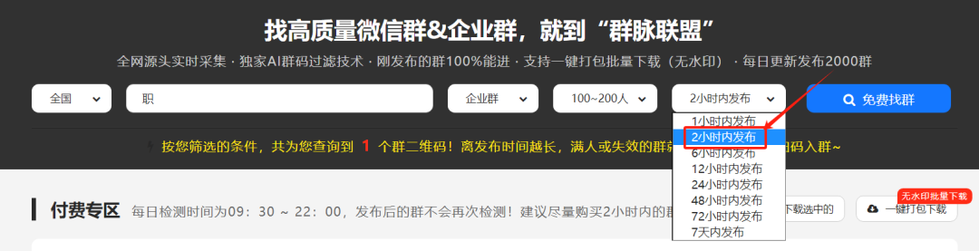 5)群的检测发布时间这里,可以选择2小时以内,白天也可以选择1小时以内。如果你比较忙的话,可以选择6小时以内,这种群就会慢些。一个群能在1小时以内达到100人以上,可以证明这个群是非常活跃,质量还是比较高。