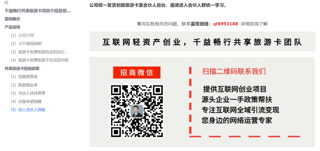 上面这张图就是咱们共享旅游卡项目,我设置添加好友通过后自动发送的欢迎语,也是咱们的第一道指令。这里主要是简单介绍项目,和引导客户扫码进考察群。