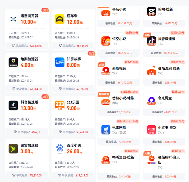 像懂车帝、剪映、小红书、番茄小说、抖音极速版这些,都是比较稳定,单价也还不错的平台。小红书拉新,最高的时候有30左右一个用户,快手拉新,最高的时候有120左右一个,APP拉新,只要长期有,这种大平台,都是稳赚。