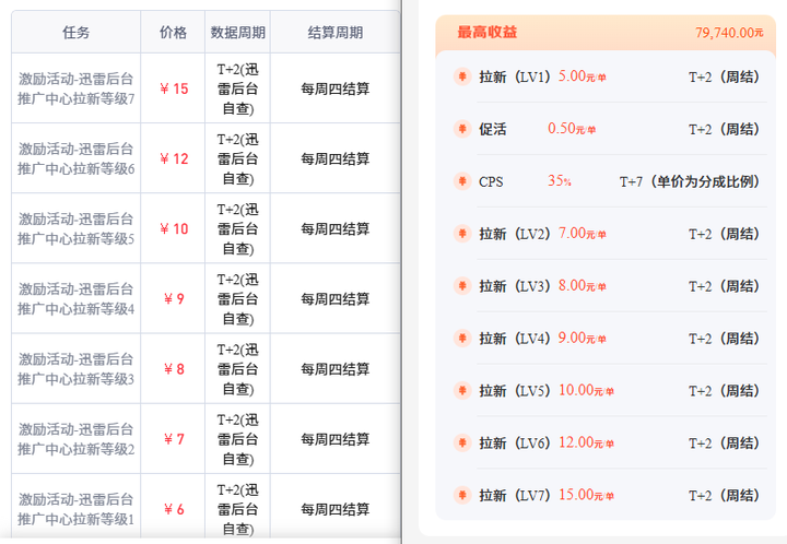 比如前面第3点的图中,抖音极速版,在A平台是13元,在B平台是14元,毫无疑问,他们几乎都会选择B平台去推广。像这是迅雷拉新,两个平台的利润差不多,但也会有些区别。