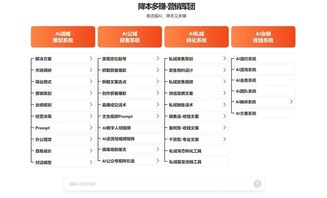 而这套完整的AI获客系统,是一个集成了55把刀的 “全自动柴火工厂”。你只需要建好这座工厂,它就会自动将漫山遍野的树木(公域流量)加工成整齐的柴火(私域资产),再自动卖给需要取暖的人(客户成交)。