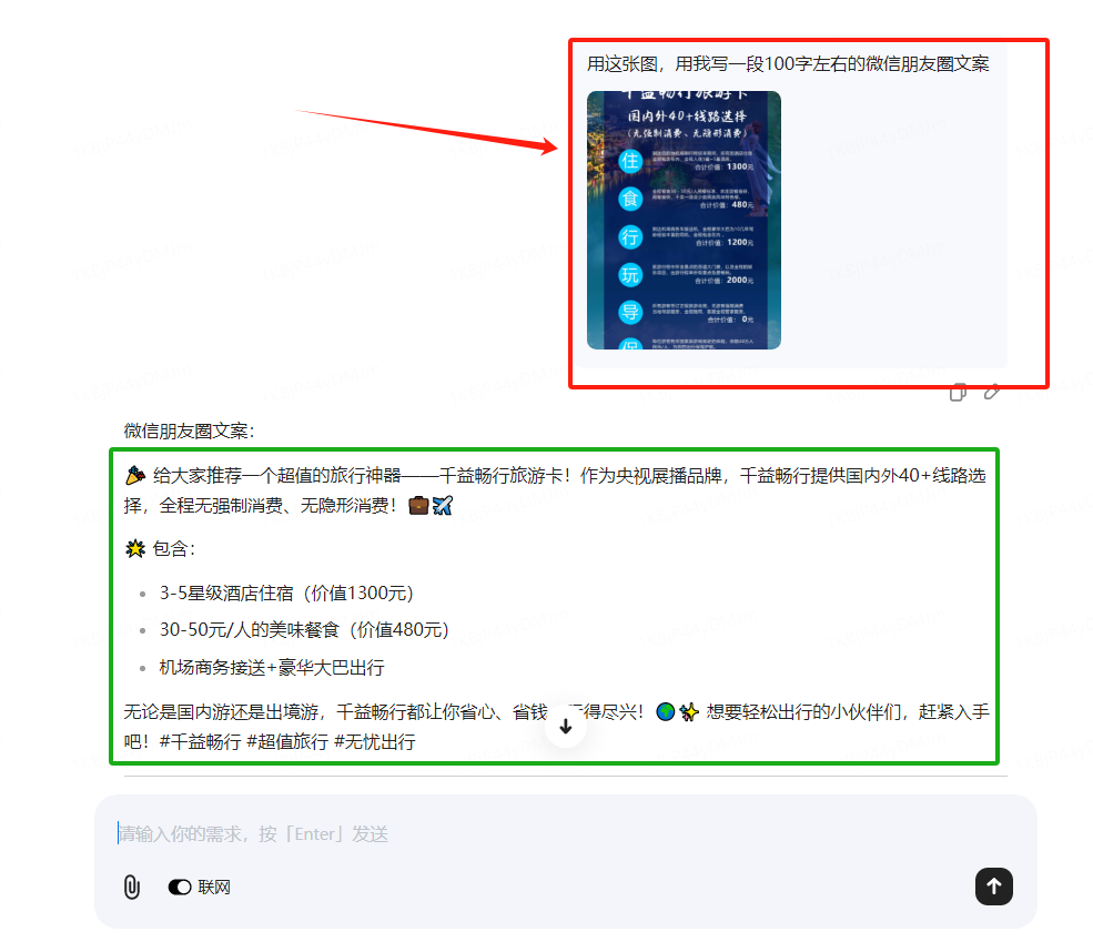比如我现在用咱们的旅游卡项目来举例,我直接现在想要写一篇朋友圈文案,但是没有思路。现在我直接把这张图片传给AI工具,给他指令,让他帮我快速搞定。