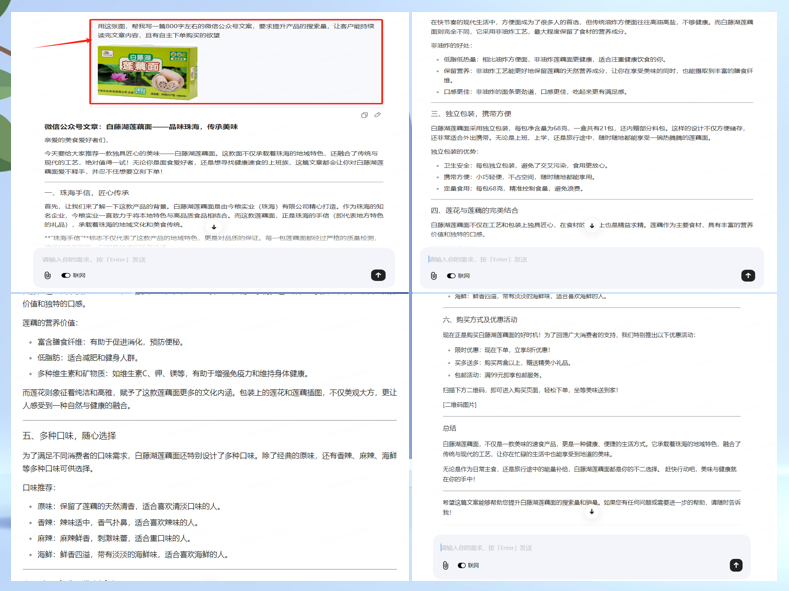 再比如你是做电商,像咱们张总的这个莲藕面,珠海的品牌,我对这个产品不了解,现在要我写文案我还需要收集很多内容。接下来我直接把这个面的封面图片给下载来,然后直接让这款AI工具帮助我写公众号的推广文案。