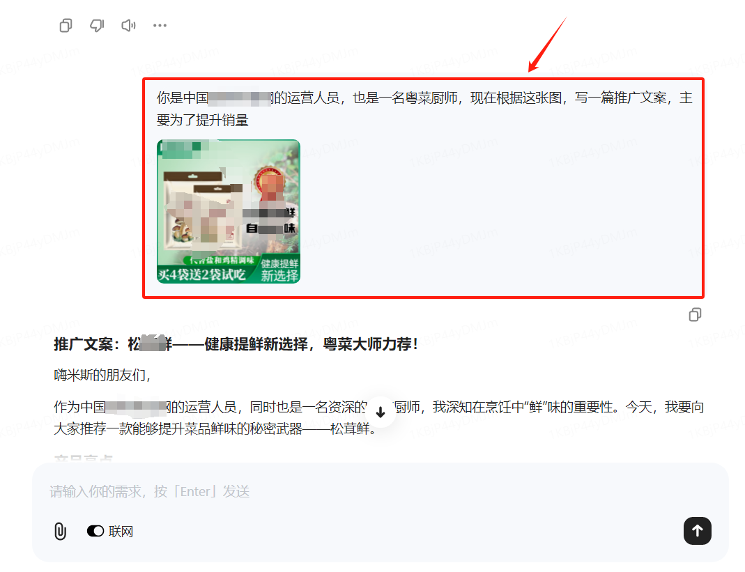 我直接把这张封面图上传去,直接给个简单的指令:“用这张图,帮我写一篇800字左右的微信公众号文案,要求提升产品的搜索量,让客户能持续读完文章内容,且有自主下单购买的欲望”,接下来很快就直接通过这张图片,把这款产品相关的信息都给我写出来了,这个功能简单太牛了。