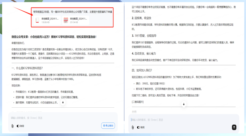 我直接找了他们做学科资料的内容,拿了两张图,直接让AI工具帮我写一篇公众号推广文案,不到10秒钟,一篇800多字的微信公众号文案就写好了。对于很多做虚拟资料的朋友,用这款AI工具,帮助你写公众号推广文案,事半功倍。