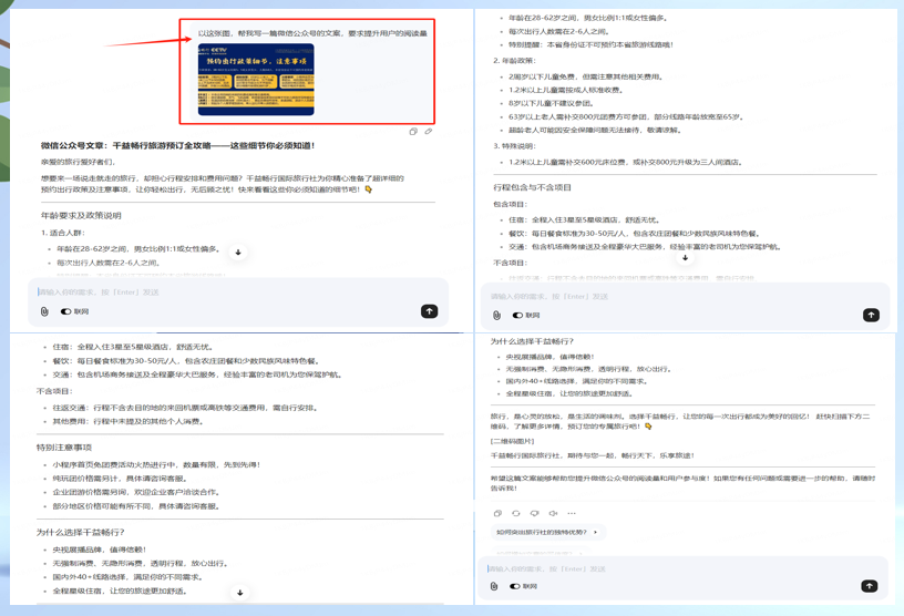 再比如我现在要写一篇公众号文章,但是没有思路,于是,我使用一张旅游卡的宣传图片,直接让这款AI工具帮助我写。它可以快速识别这张图片的内容,然后根据我的要求,帮我写成公众号的文案。