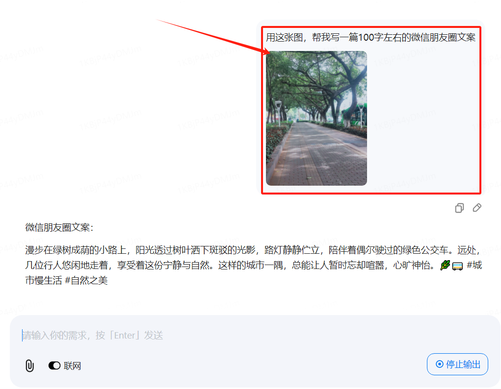 比如前几天我随手拍照的这张照片,我要发朋友圈,但是不知道怎么写文案,于是,我直接上传给AI,让他以这张图,帮我写一篇100字左右的微信朋友圈文案。