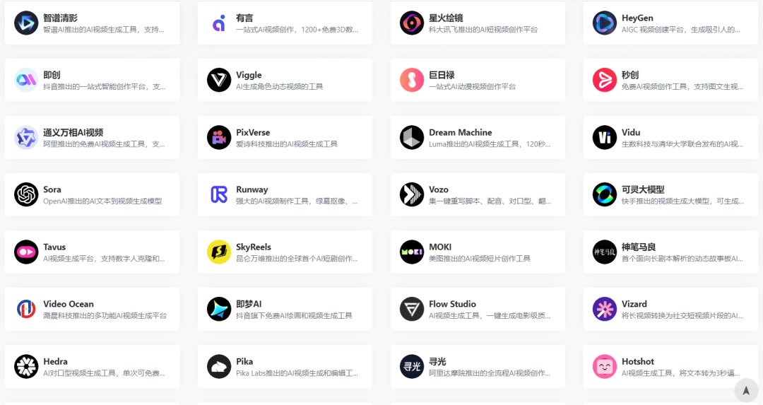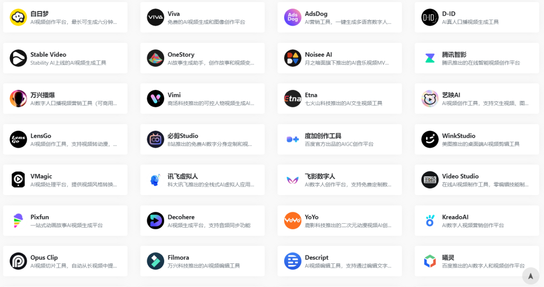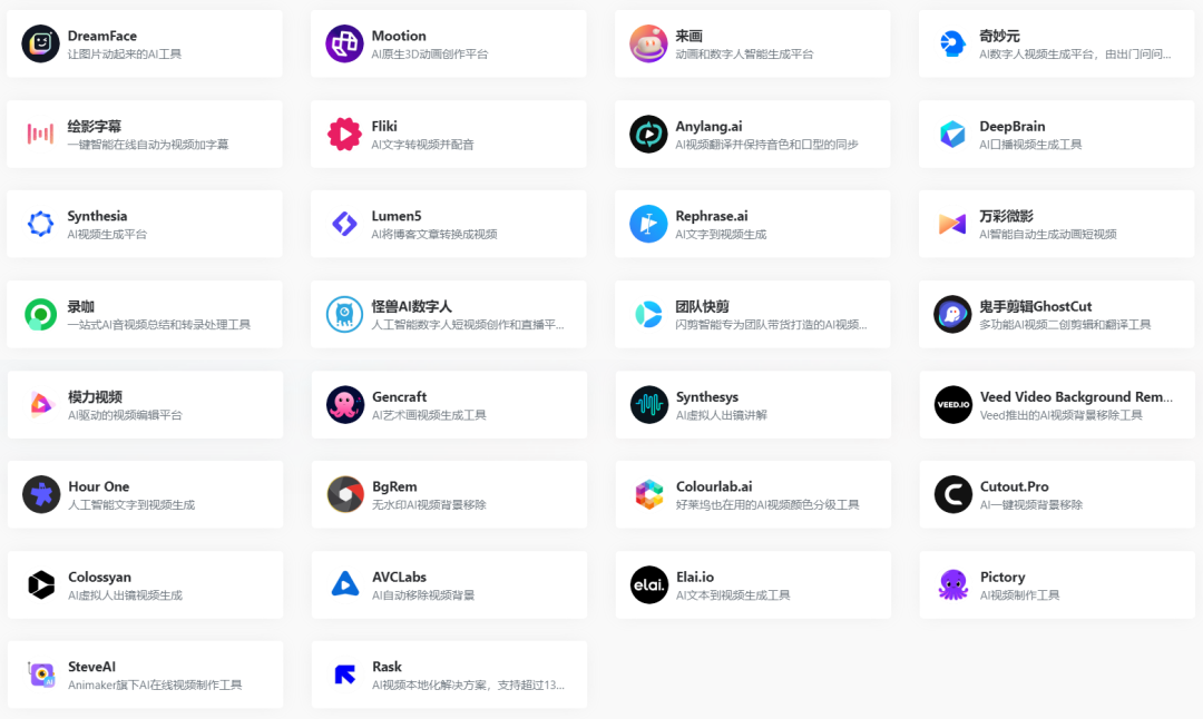 先看第一组42款视频AI工具,名称和1句话介绍,这样可以让你快速找到需求的视频AI工具。