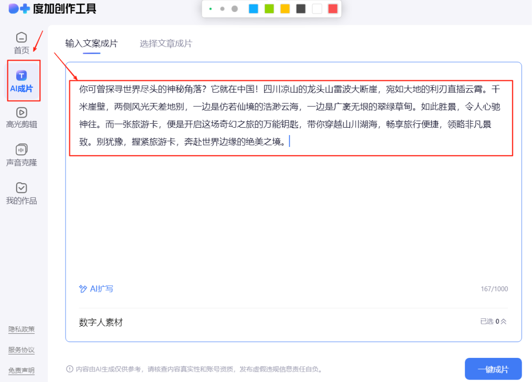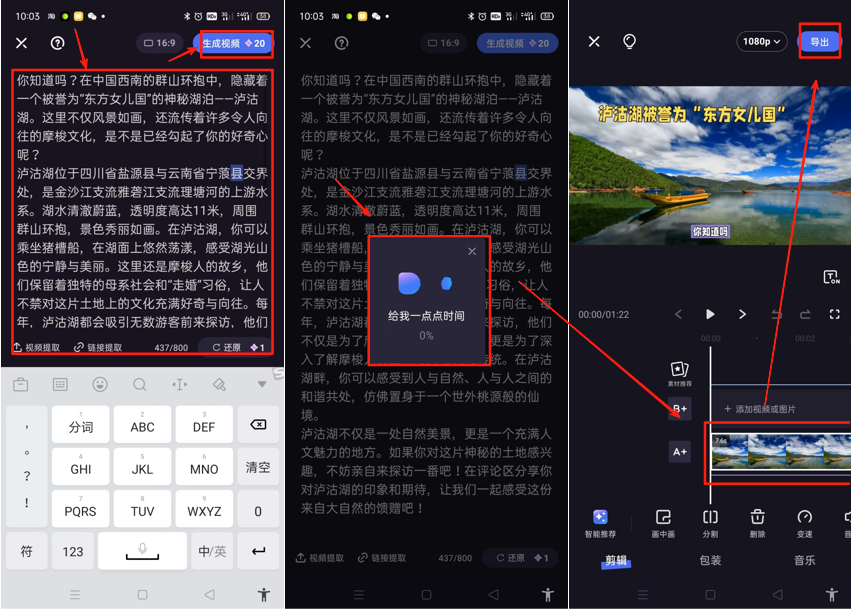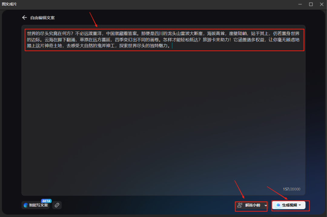 昨天晚上培训结束后,还有伙伴在群里问,有没人可以用文字生成视频的工具。这里有两种理由,一种是一用文案一键做视频,另一种理由是文生视频。昨天在直播里面我也有讲到,并且已经有教实操。用文案生成视频的方法,很简单,全套用了3款工具,分享了2种方法,都非常实用。在开始今天正式内容之前,在此提醒下,本月福利活动还有最后6天,点击这篇“零成本创业,用好这5招搞钱秘密!”拉到文章底部获取名额。分享3款工具2种方法,1分钟教会你,直接上实操。内容不多,但比较重要,想做视频创作的朋友,建议点在看收藏备用,方便后续查阅。找爆款文案的方法主要用5种:电商平台购买、自媒体平台搜索、搜索引擎搜索、第三方工具采集、私域收集。电商平台购买:想要什么类目的爆款文案,直接到电商平台,利用行业关键词加文案搜索,在出来的结果中,选择适合的内容购买。自媒体平台搜索:这是比较常用的方法,比如抖音、微信、小红书、快手、B站,微博、知乎等,这些都是咱们常使用的自媒体平台。利用关键词,直接在平台搜索,用平台本身的筛选功能筛选找爆款。搜索引擎搜索:这种方法主要依靠各大搜索引擎及自媒体平台的推荐,相对来讲会使用比较少。直接在搜索引擎输入行业关键词,寻找排列前5页且匹配度高的文案内容。第三方工具采集:这种是多数运营人员使用比较多的,比如5118、星网大数据、今日热点榜、易撰、新榜、飞瓜数据、蝉妈妈、各类AI工具询盘等。因为第三方工具几乎都是需要收费,所以,几乎都是有一定经验的朋友使用比较多。私域收集:通过每天的朋友圈,朋友的分享,各大社交媒体的好友或是大V的推荐。这种私域收集会比较慢,且精准性不够强,仅作为参考。以上这5种找爆款文案的方法,想省成本,且相对比较有效的方法,就是用自媒体平台搜索。有一定的营销预算,想要更深入去研究,可以使用第三方工具采集,获取的数据会更精准。修改文案主要使用豆包AI工具,把咱们获取的爆款文案,放入到豆包AI工具里面,让其分析相关的文案结构,然后给它关键词,让它模仿这样的结构,重新写出新的爆款文案。想要批量生成,就可以把需要生成的数量、字数、关键词要求这些指令给到AI,让它帮完成。比如昨晚我在直播的时候给伙伴们演示的,生成10篇相似的爆款文案,不到30秒就完成了,速度非常快。除了使用豆包,还可以使用文心一言、讯飞星火、Kimi、通义千问、智谱清言等。每款工具生成出来的内容会有差异,个人觉得比较好用的就是豆包。这里有一个环节,就是提取视频文案,如果是抖音的,可以直接复制链接到豆包里面读取。如果是其他平台,可以直接使用该平台支持的相关提取工具,具体可以使用关键词搜索,都能找到很多免费的视频文案提取工具。第一种方法:使用的工具主要是剪映。把生成的爆款文案复制,然后打开剪映,选择里面的图文成片功能。把前面写好的文案粘贴进来,选择配音员的声音,点击生成视频,大概1分钟左右,就会根据文案生成一条视频,并且帮你已经完成视频包装。这里有两个技巧:如果你不会改写文案,就直接找别人的爆款文案开头,或是标题,以及话题,然后选择这里对应的类目,粘贴进去,选择视频时长,让系统自动帮你生成文案。另外一个技巧,就是点击自由文案后,直接只输入一个主题,或是产品名称、菜品、或是景区名称等这种关键词,点击生成,这时候系统就会自动生成文案。每次可以生成3篇文案,你可以自己选择使用。如果不满意,还可以重新生成。如果满意,点击生成视频,系统就会去匹配图文素材,开始创作视频。第二种方法:使用的工具主要是度加剪辑。打开度加剪辑,找到AI成片功能,把咱们需要生成视频的文案给复制粘贴进来。点击一键成片,系统就会快速的匹配视频素材,做出一条视频。生成的这条视频,是系统自动匹配的素材,都是比较高清的。这里和用剪映图文成片功能的区别在于,这里都是视频素材,剪映里面的图文成片,多数素材都是图片,少数是视频,且清晰度相对较差。生成视频后,直接去发布就可以了。如果是使用电脑版,这里发布只能发布到百家号。如果是使用手机版,除了可以发布到百家号,还会自动保存一份到手机。这里有2个技巧:一种是有文案的,就复制粘贴文案过来一键成片。另一种是没有文案,可以直接使用产品名、或是关键词,让AI自动帮你写出文案,然后通过文案一键成片。用AI改写一次消耗1积分,生成一条视频消耗20积分。根据生成的文案,直接点击生成视频,这时候AI就会提示给我一点点时间在生成中,大概1分钟左右完成,导出即可。利用度加剪辑这里还有比较关键的地方:如果咱们是要创作分享到抖音、视频号等这些平台的内容,记得使用手机端操作。度加剪辑导出的时候,还会自动导出包装好的视频封面,这个比剪映要灵活。因为度加剪辑是免费的工具,但每天会需要积分,积分主要是靠签到和分享、导出视频、和发布视频4种方式获取。这里富哥也做了获取积分的解决方案:一种就是每天手机端签到有10积分,同账号在电脑端签到有100积分,多导出几次视频每一次可以获得20积分,最后一种就是发布一条视频有20积分。前面我讲的每天5条视频,主要是考虑到积分消耗的问题。利用上面富哥分享的这四种获取积分的方式,每天你可以多获得几百积分,多做几十条视频没有问题。剪映和度