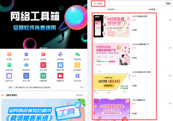 在咱们的资源站里面也是一样,比如我想要学习小红书相关的项目,我就直接输入“小红书”,这样就可以得到很多关于小红书的搞钱项目。还可以精细化搜索,比如小红书虚拟资料,小红书书单,小红书流量主等,这种关键词搜索。