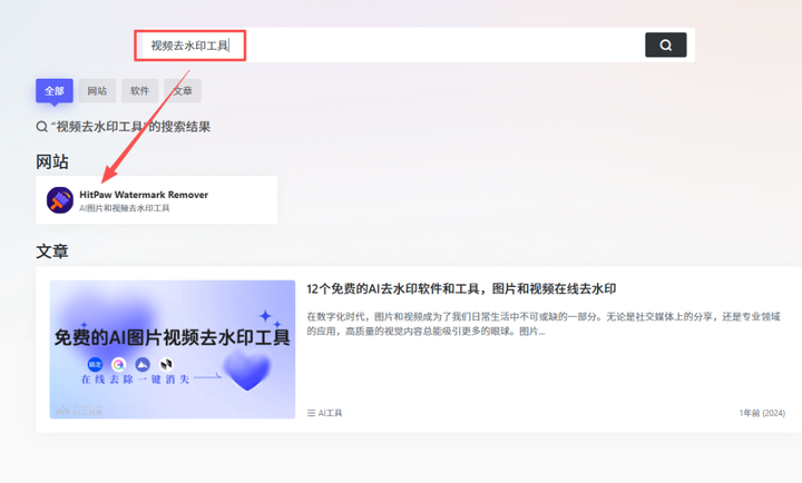 你看下,像我搜索“视频去水印工具”,这样就直接搜索出来了,也就是我们平时看到很多博主分享的Remover这个工具。想要什么功能,直接输入功能,或是工具名称,都可以找到。