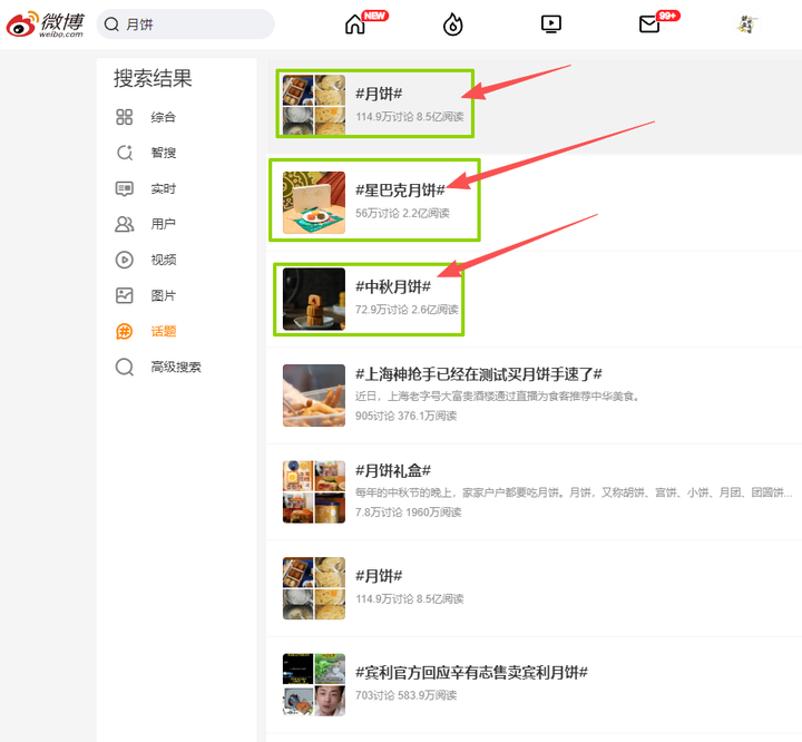 像月饼这个关键词搜索出来的话题,里面的三个话题“月饼”“星巴克月饼”“中秋月饼”,都是讨论量比较大的,你直接进去,话题,看看点赞和评论最高的内容,他们都发了些什么内容,从里面去找信息和灵感。