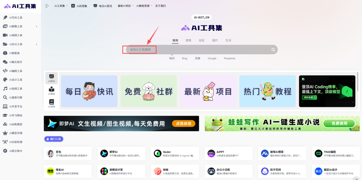 比如我平时用来找AI工具的这个AI工具集,里面汇聚了国内外1000+的AI工具。想要搜索使用AI工具的时候,我直接进去这里搜索,可以快速找到,不用自己去到百度上去搜索那么慢。