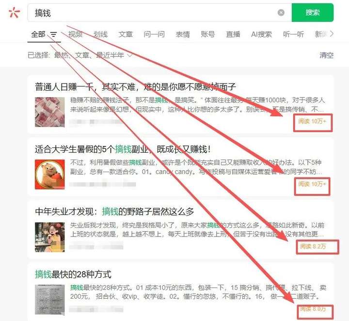 通过前面的筛选条件,选择文章,最热,最近半年,范围不限,这样出来阅读量最高的在前面,你就可以直接点击进去看别人的文章,在别人文章里面找信息,找灵感。