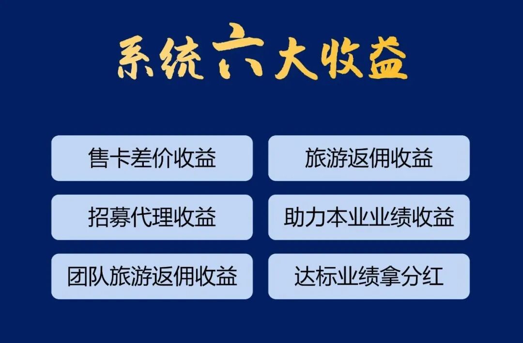 出行赚管道:只要是客户使用自己名下的旅游卡出行,都有旅游佣金。团队伙伴客户出行,还有级差佣金。单卡佣金最高可达12420元,9000张的伙伴可享受5%平级奖励。铺卡越多,出行的客户越多,利润就越高。每月10-30个客户出行,一年多赚30-50万完全没问题。